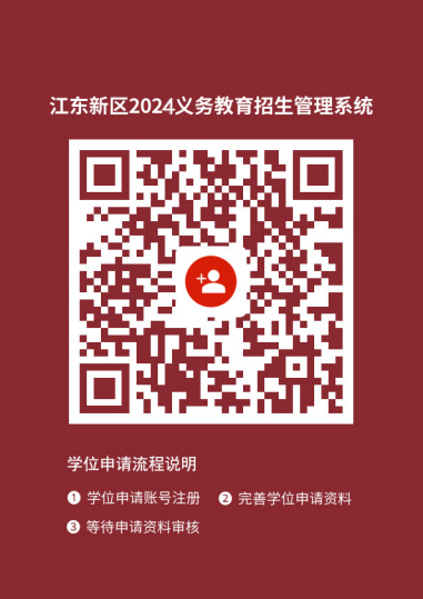 1月20日至24日,登錄“江東新區(qū)義務教育招生管理系統(tǒng)”(見附件,請掃描二維碼)平臺,按要求上傳學位申請材料(資料不齊、信息有誤、未按時申請等情況,將不予安排學位)。