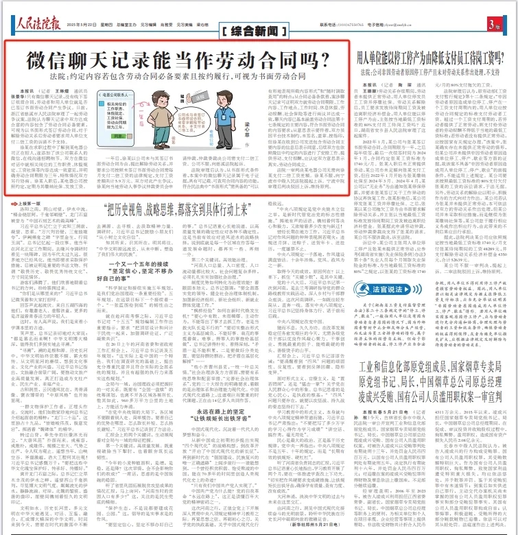 法院:約定內(nèi)容若包含勞動合同必備要素且按約履行,可視為書面勞動合同 只有微信聊天記錄,沒有線下簽訂紙質(zhì)合同,勞動者和用人單位就是否已簽訂書面勞動合同產(chǎn)生爭議。日前,浙江省慈溪市人民法院審理了一起勞動爭議案,法院認為聊天記錄中雙方達成合意的內(nèi)容包含了勞動合同必備要素,可視為以書面形式簽訂勞動合同,對于解除勞動關系后勞動者要求用人單位支付二倍工資的訴請不予支持。 徐某在求職過程中了解到某電器公司正在招人,遂添加了該公司聯(lián)系人的微信,在線溝通招聘細節(jié)。雙方在微信對話中就相關崗位的工作職責、休假規(guī)定、工資社保等內(nèi)容達成一致意見,并明確勞動合同期限為三年,特殊情況雙方另行協(xié)商。徐某入職后,某電器公司按照約定,定期為其繳納社保、發(fā)放工資。 一年后,徐某以公司未與其簽訂書面勞動合同為由,提出解除勞動關系,并要求公司按照未簽訂書面勞動合同需每月支付二倍工資的法律規(guī)定,支付工資差額共計5.9萬元。雙方對此產(chǎn)生爭議,徐某向當?shù)貏趧尤耸聽幾h仲裁委員會申請仲裁,仲裁委裁決公司需支付二倍工資。公司不服,向慈溪市人民法院起訴。 法院審理后認為,從書面形式條件看,本案中的微信聊天記錄屬于電子證據(jù),具有可記載、可查用合同內(nèi)容的功能,符合民法典中“書面形式”需具備的“可以有形地表現(xiàn)所載內(nèi)容形式”和“隨時調(diào)取查用”的特點;從合同必備條款看,案涉聊天記錄可證明雙方就勞動合同期限、工作內(nèi)容、工作地點、工作時間、休息休假、勞動報酬、社會保險等進行商議并達成一致,聊天內(nèi)容已基本涵蓋勞動合同法第十七條規(guī)定的主要內(nèi)容,符合書面勞動合同的內(nèi)容要求;從意思表示要件看,雙方雖因平臺技術制約,未簽名、蓋章、按指印,但徐某在收到公司發(fā)送包含勞動合同主要內(nèi)容的信息后表示同意,后續(xù)雙方也依照微信中約定的內(nèi)容進行了安排工作、提供勞動、支付報酬,應認定雙方意思表示真實,勞動合同成立。 法院一審判決某電器公司無需向徐某支付二倍工資差額。徐某不服,向?qū)幉ㄊ兄屑壢嗣穹ㄔ禾崞鹕显V。寧波市中級人民法院審理后判決駁回上訴,維持原判。